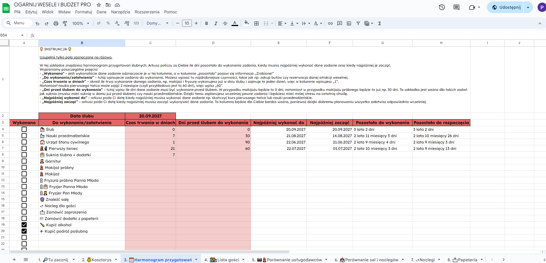 Dzięki haromonogramowi nie pominiesz żadnej rzeczy do załatwienia! A nasz arkusz policzy Wam ile dni macie do wykonania danej rzeczy i kiedy musicie najpóźniej zacząć np. naukę pierwszego tańca.