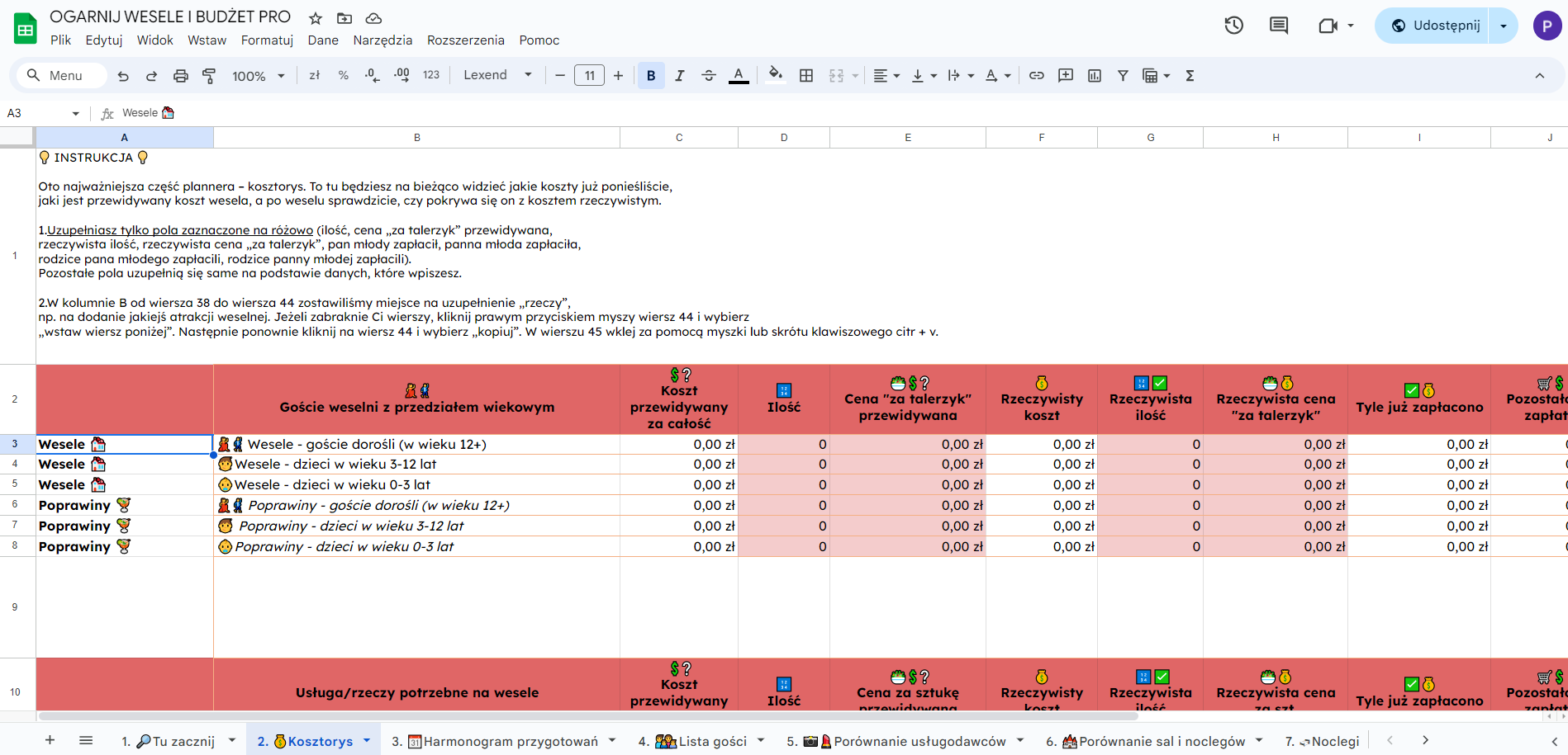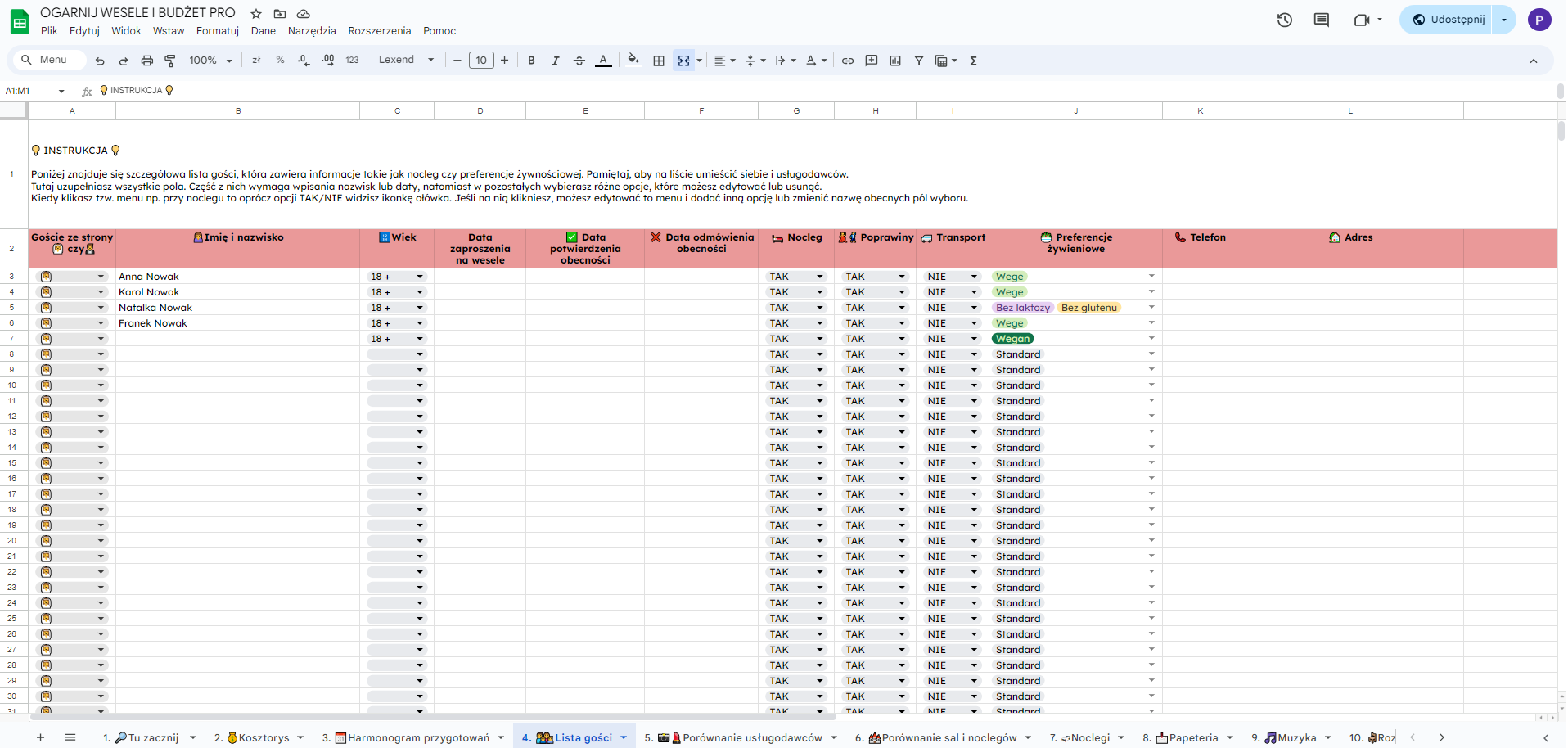Znajdziecie tu szczegółową listę gości, z podziałem na wiek (to ma znaczenie przy cenie „za talerzyk), nocleg, poprawiny, preferencje żywieniowe itp.
