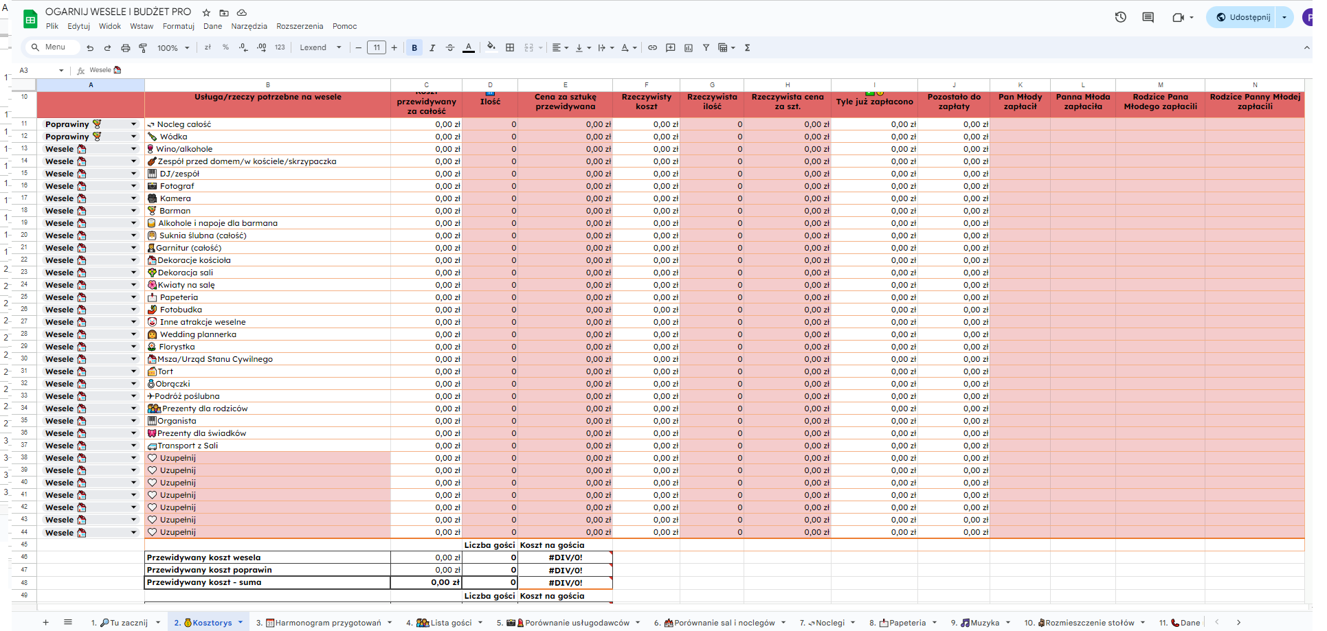Druga część dotyczy wszystkich pozostałych kosztów wesela. Arkusz policzy za Was ile przewidywaliście wydać na wesele, a ile faktycznie wydaliście. Do tego arkusz podliczy kto za co zapłacił. Jeśli nie chcesz, nie musisz uzupełniać podziału kto za co płacił. Twój arkusz – Ty decydujesz.