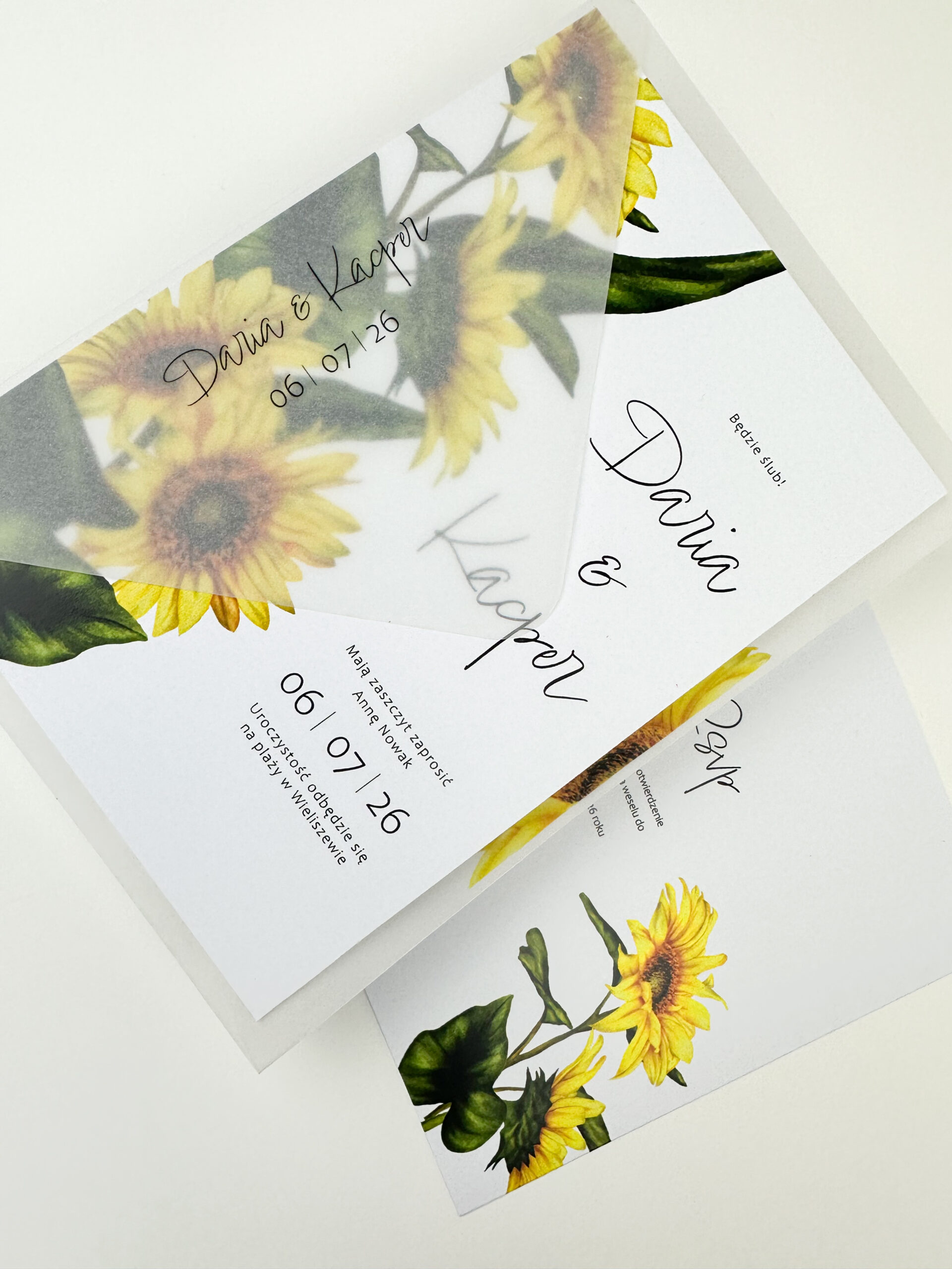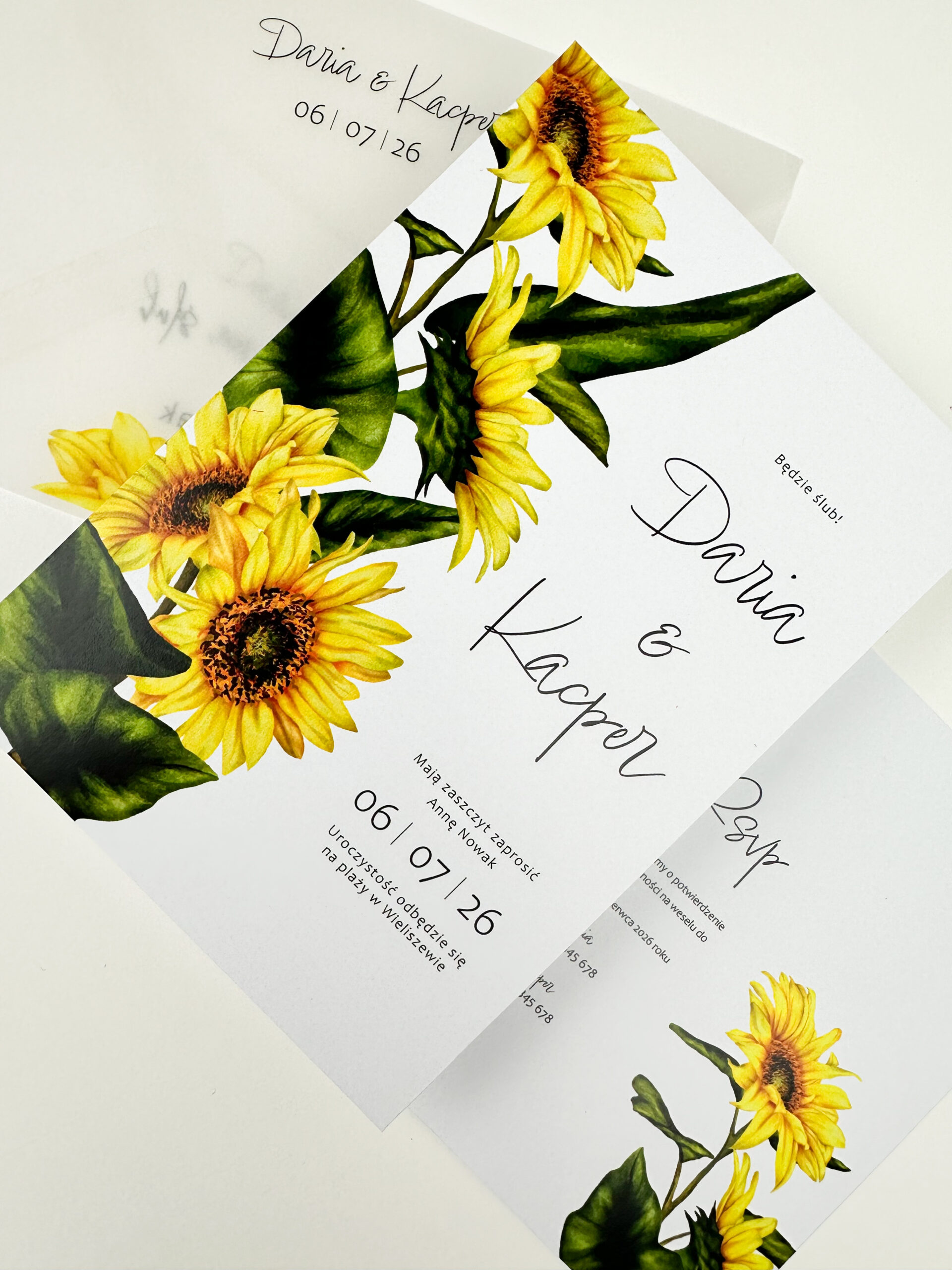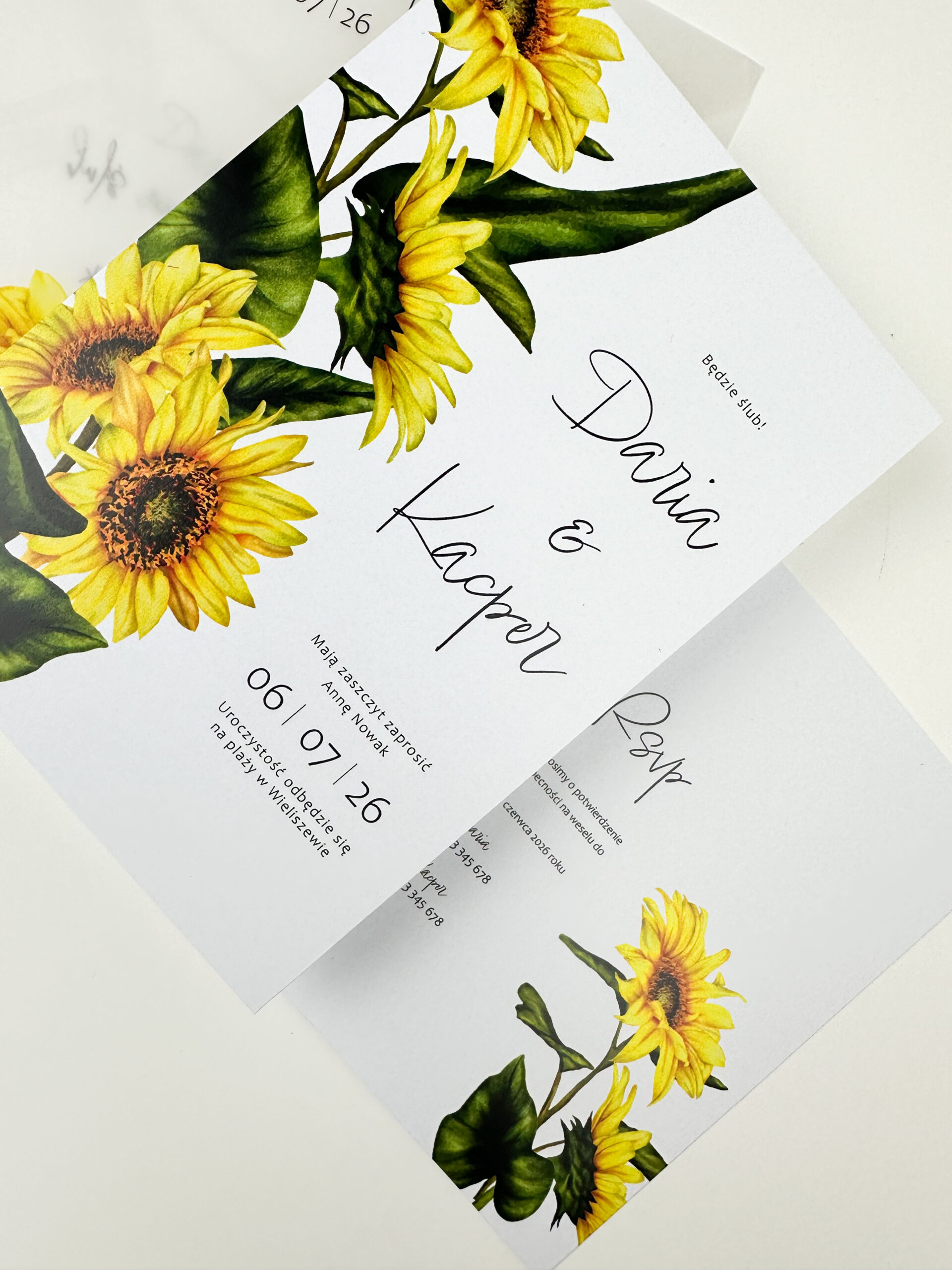 Nasze zaproszenia ślubne z motywem słoneczników to kwintesencja letniego klimatu i naturalnego piękna. Duża grafika słoneczników umieszczona po lewej stronie nadaje im wyjątkowego uroku.