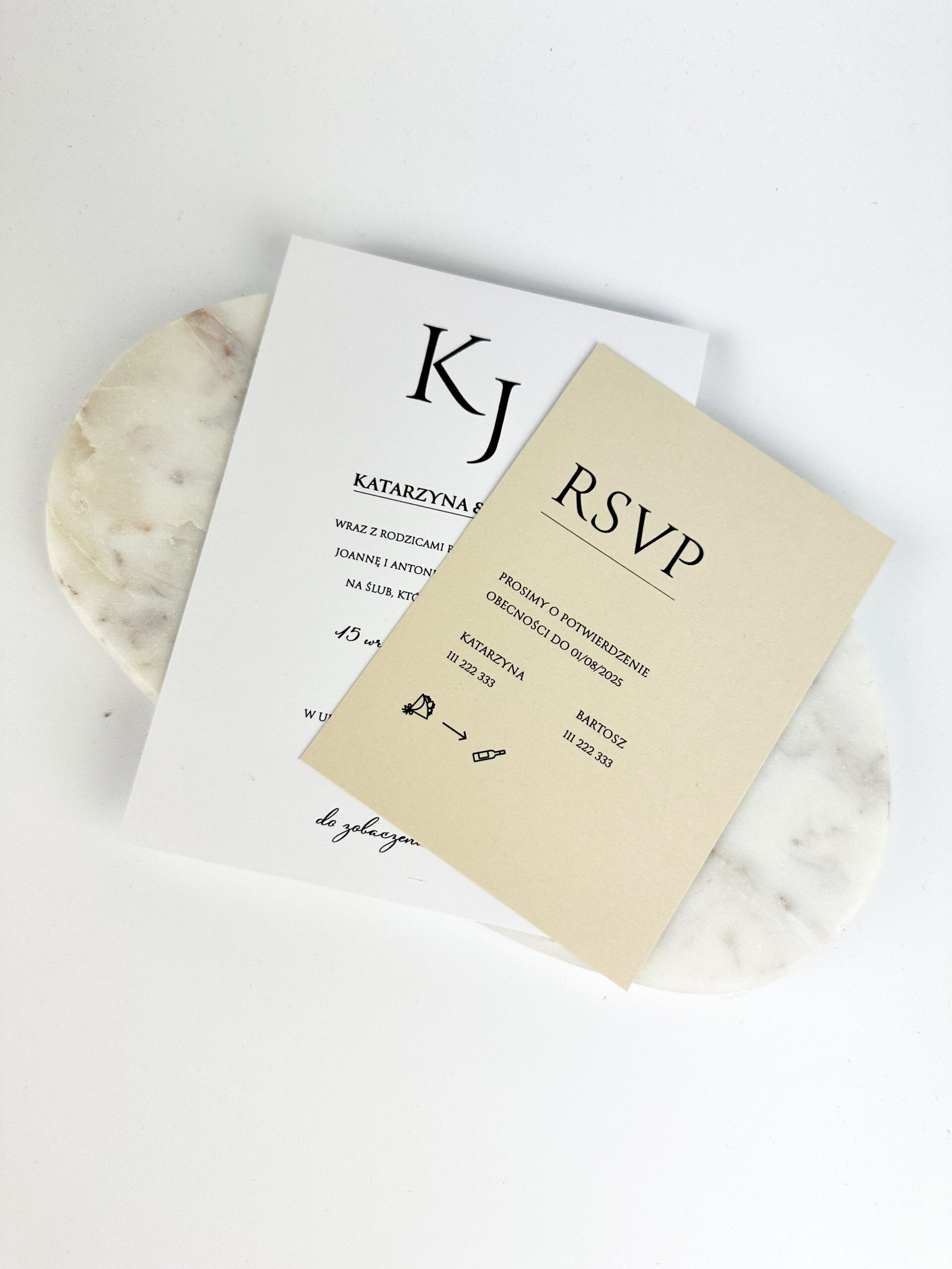 Zaproszenie ślubne minimalistyczne „Biel i beż” to idealna propozycja dla par, które cenią sobie elegancję w nowoczesnym, minimalistycznym wydaniu. Główna karta zaproszenia wykonana jest z wysokiej jakości białego papieru satynowego, który zachwyca swoją prostotą i klasycznym pięknem. Dodatkowo, do zestawu dołączone jest beżowe RSVP, które wprowadza subtelny, a jednocześnie elegancki kontrast.