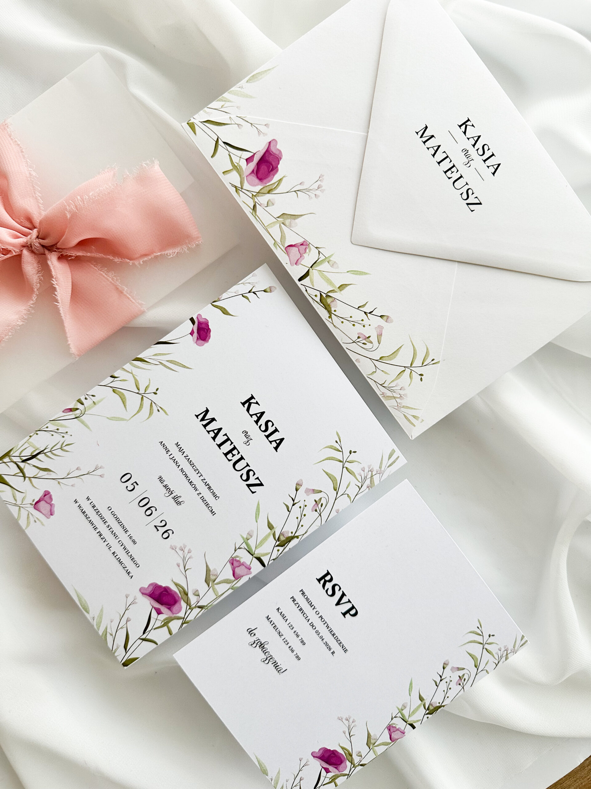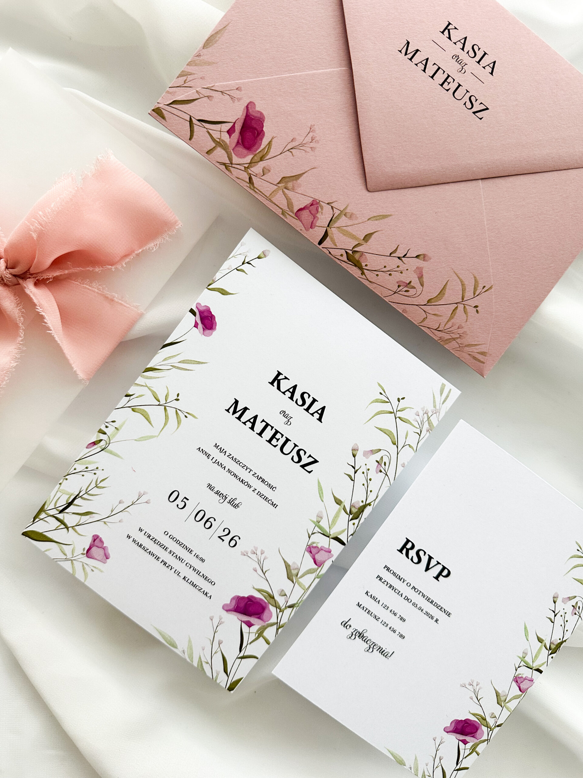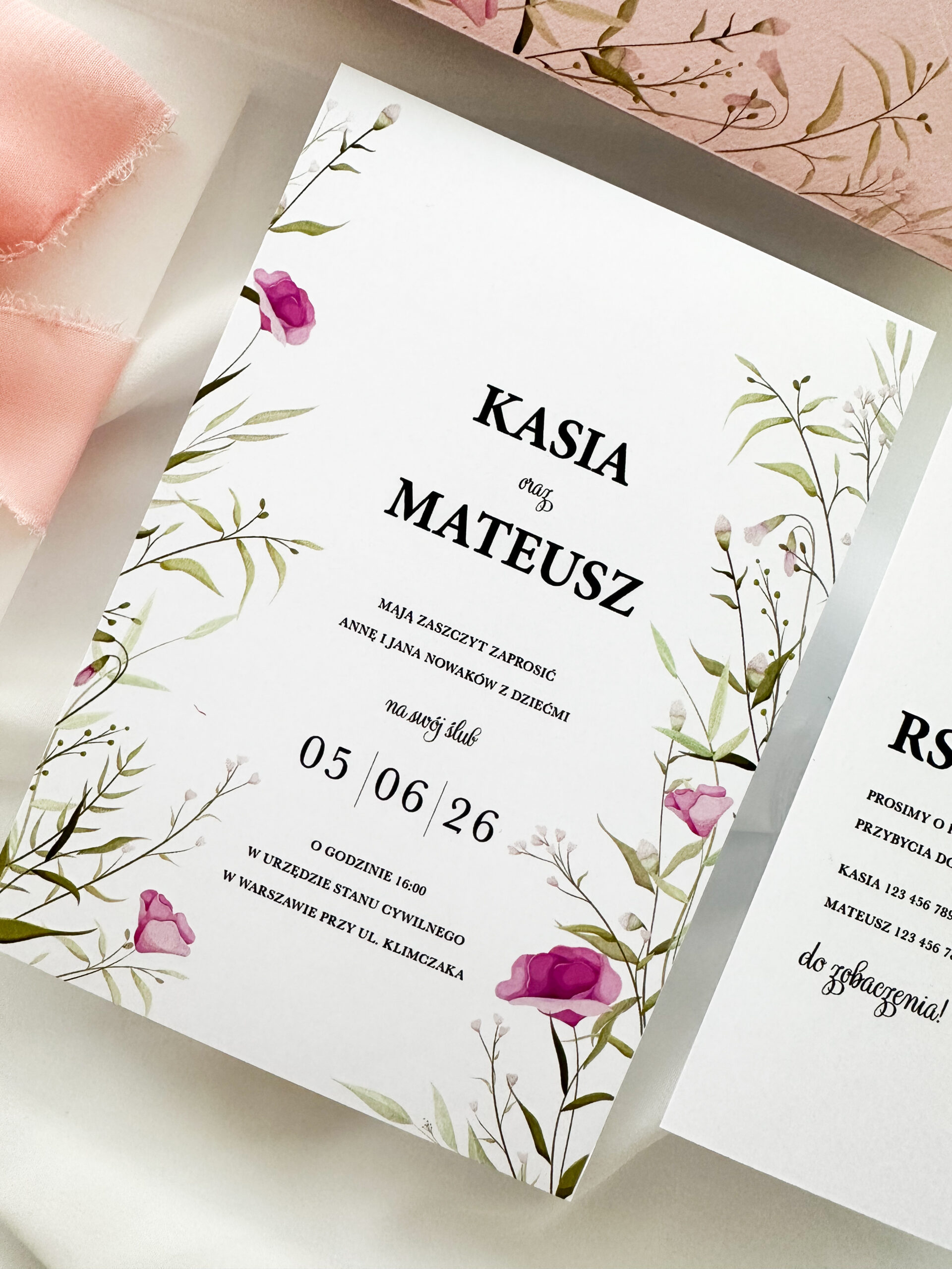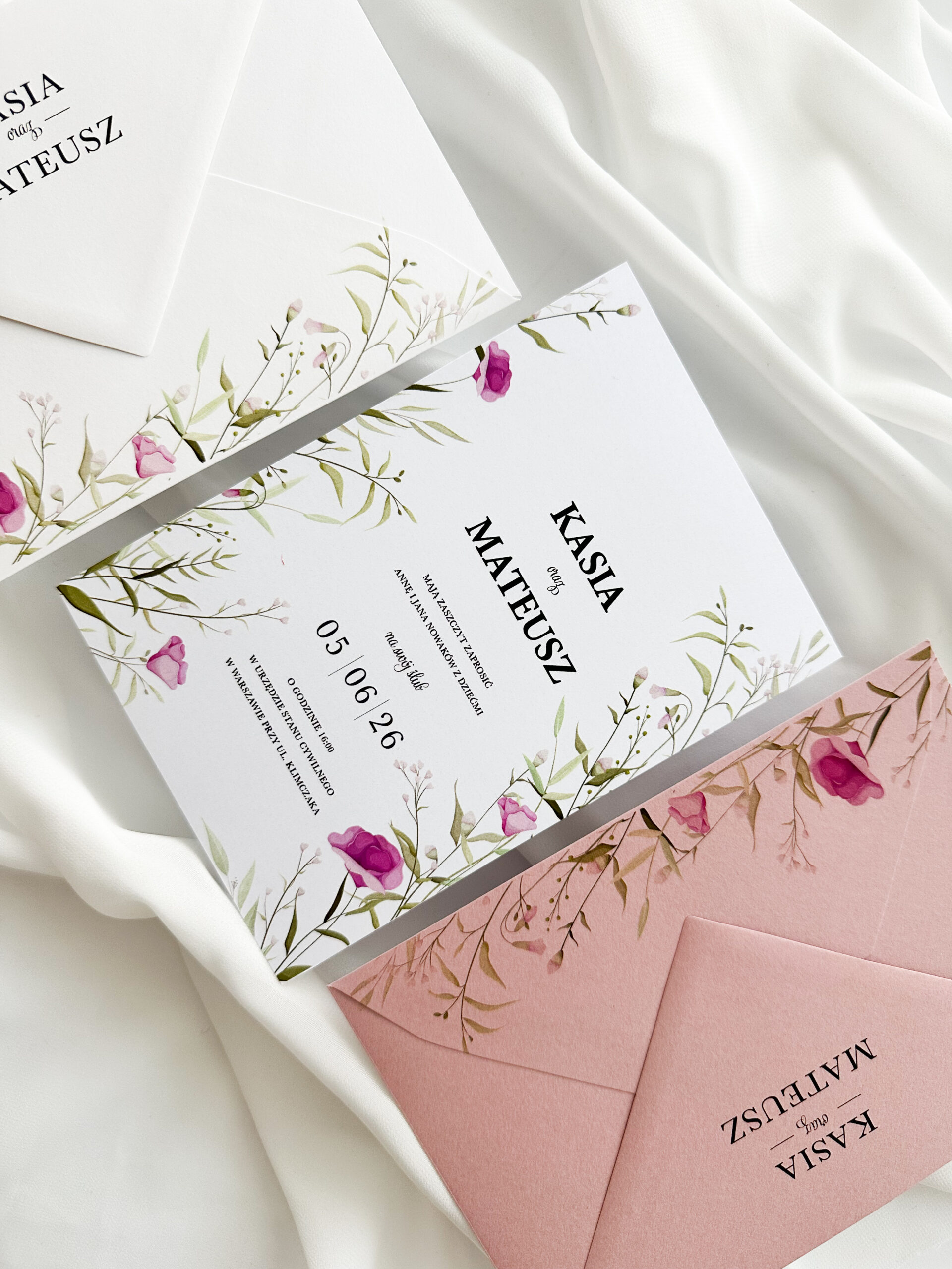 Zaproszenie ślubne „Polne kwiaty” to idealny wybór dla par, które pragną dodać swojemu wielkiemu dniu subtelności i elegancji. To zaproszenie ślubne z motywem kwiatów przyciąga wzrok swoją lekkością i delikatnością, a jednocześnie emanuje wyjątkowym urokiem. Dominujące kolory bieli i różu nadają mu romantyczny i świeży charakter, idealnie wpasowując się w wiosenne i letnie ceremonie.