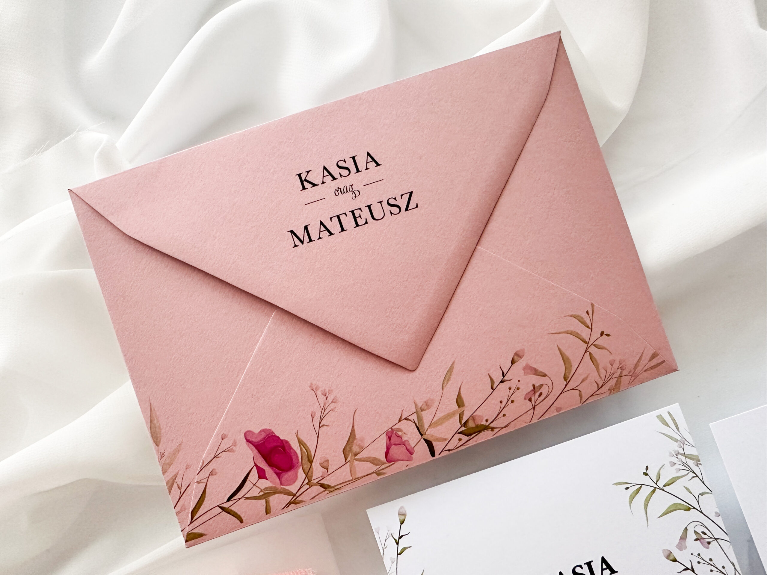 Każde zaproszenie jest starannie wykonane z najwyższej jakości materiałów, co sprawia, że jest nie tylko piękne, ale także trwałe. Dodatkowym atutem jest możliwość wyboru nadruku na kopercie, który stanowi dopełnienie całej kompozycji. Nadruk ten, również utrzymany w motywie polnych kwiatów, podkreśla spójność i dbałość o każdy detal, tworząc harmonijną całość. Zaproszenie wpisuje się w styl boho i rustykalny.