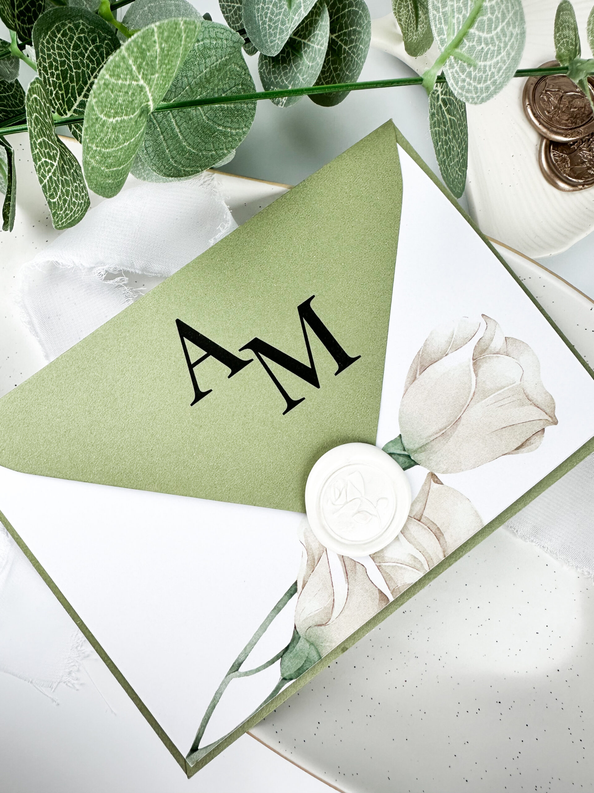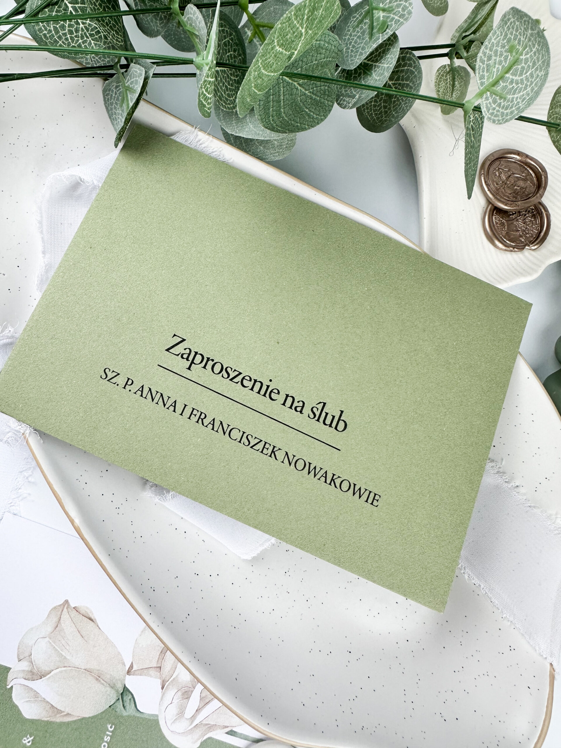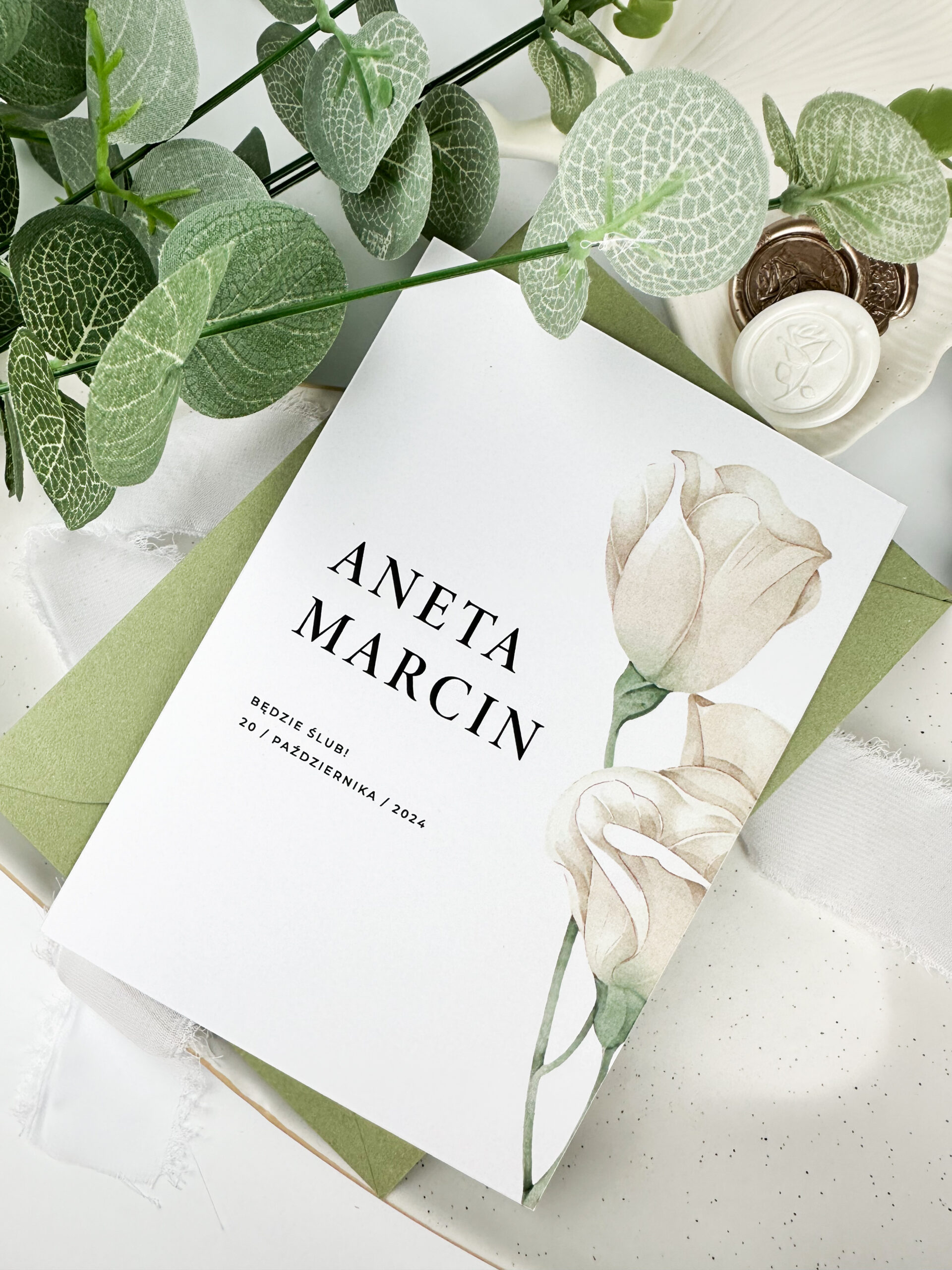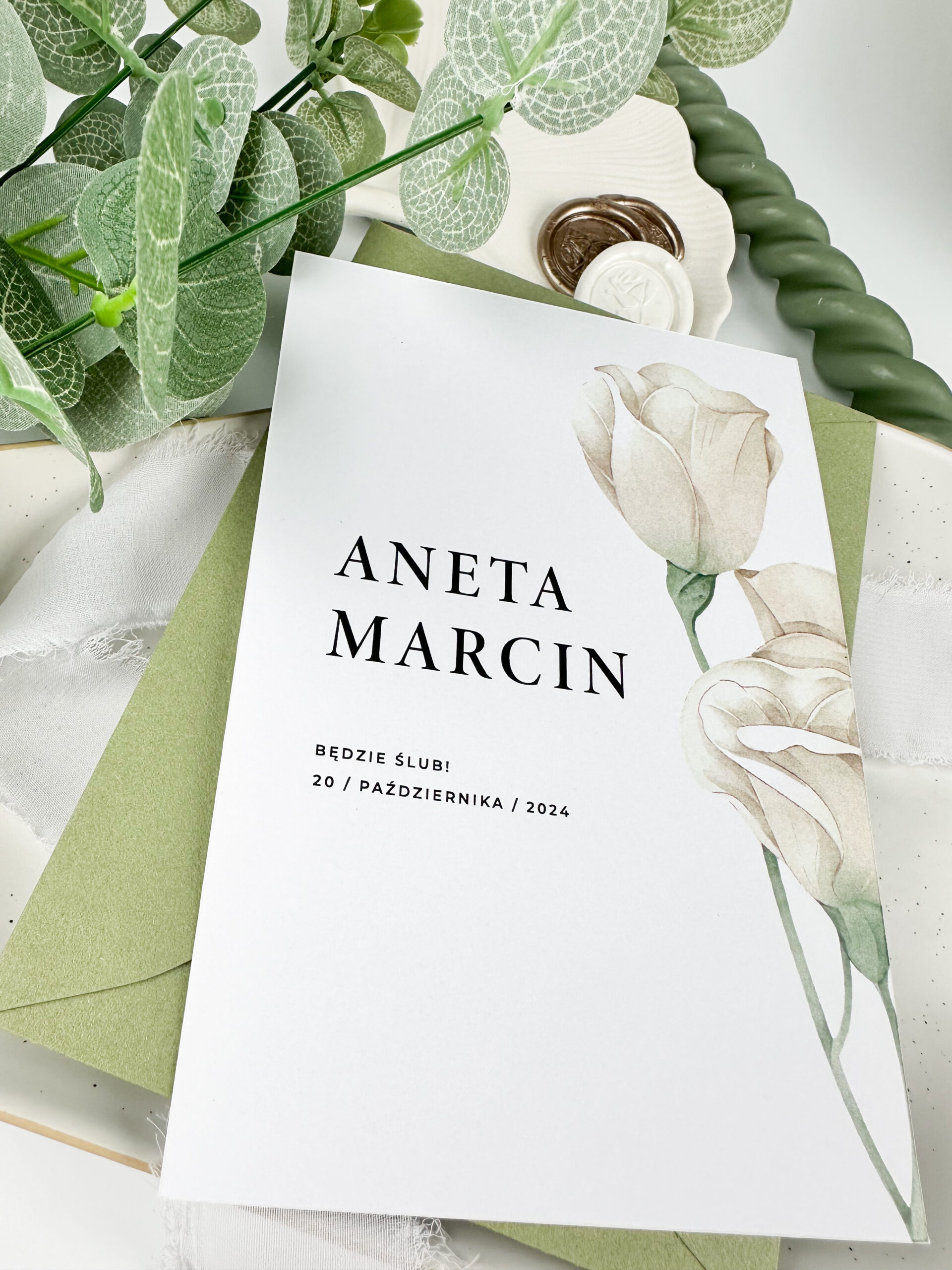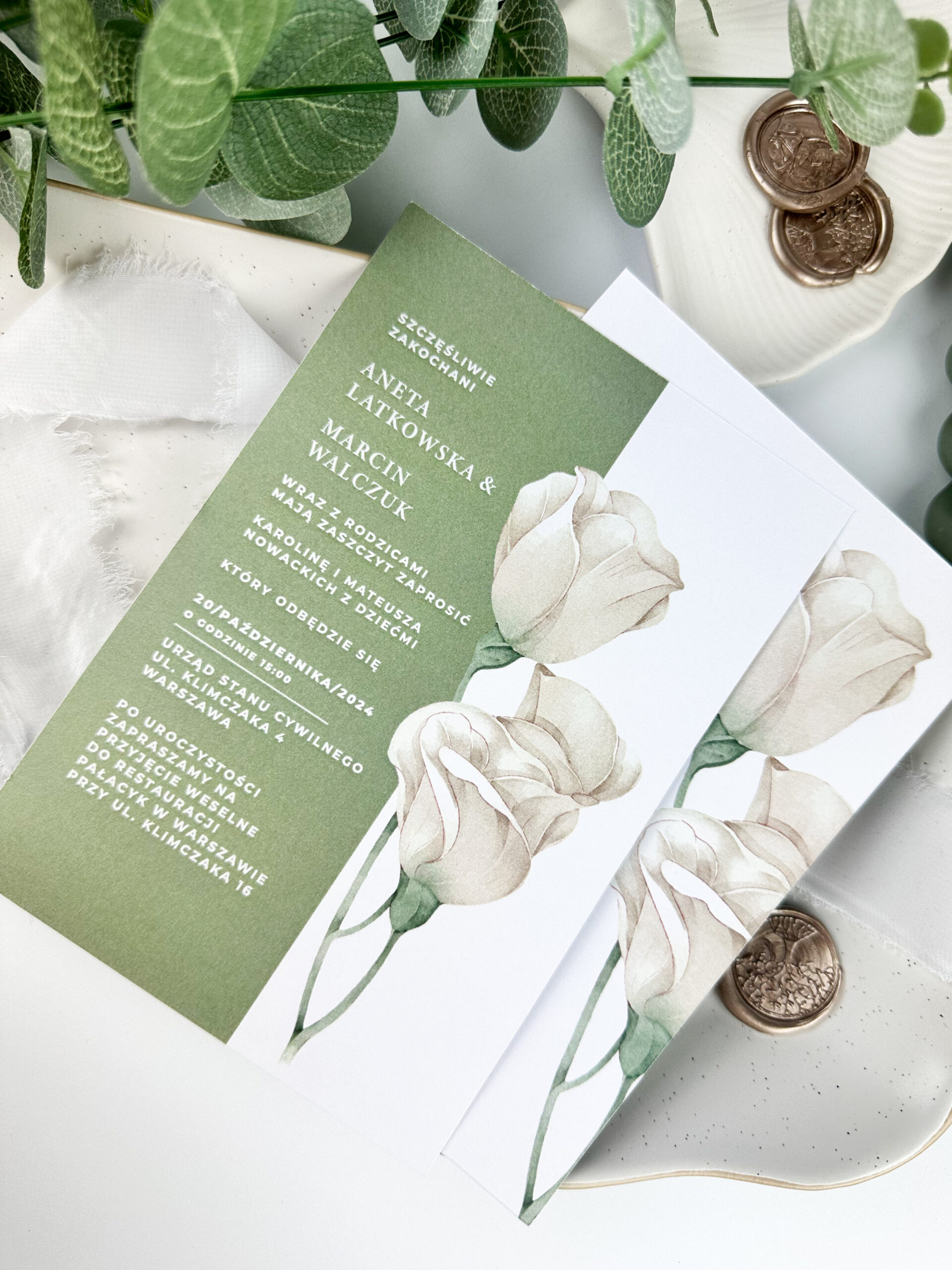 Zaproszenia ślubne są pierwszym krokiem do podzielenia się z gośćmi wyjątkowym dniem Waszego ślubu. Nasze zaproszenia ślubne w odcieniach bieli i zieleni, z pięknym motywem białej róży, łączą w sobie elegancję i prostotę, tworząc idealną oprawę dla Waszej ceremonii.